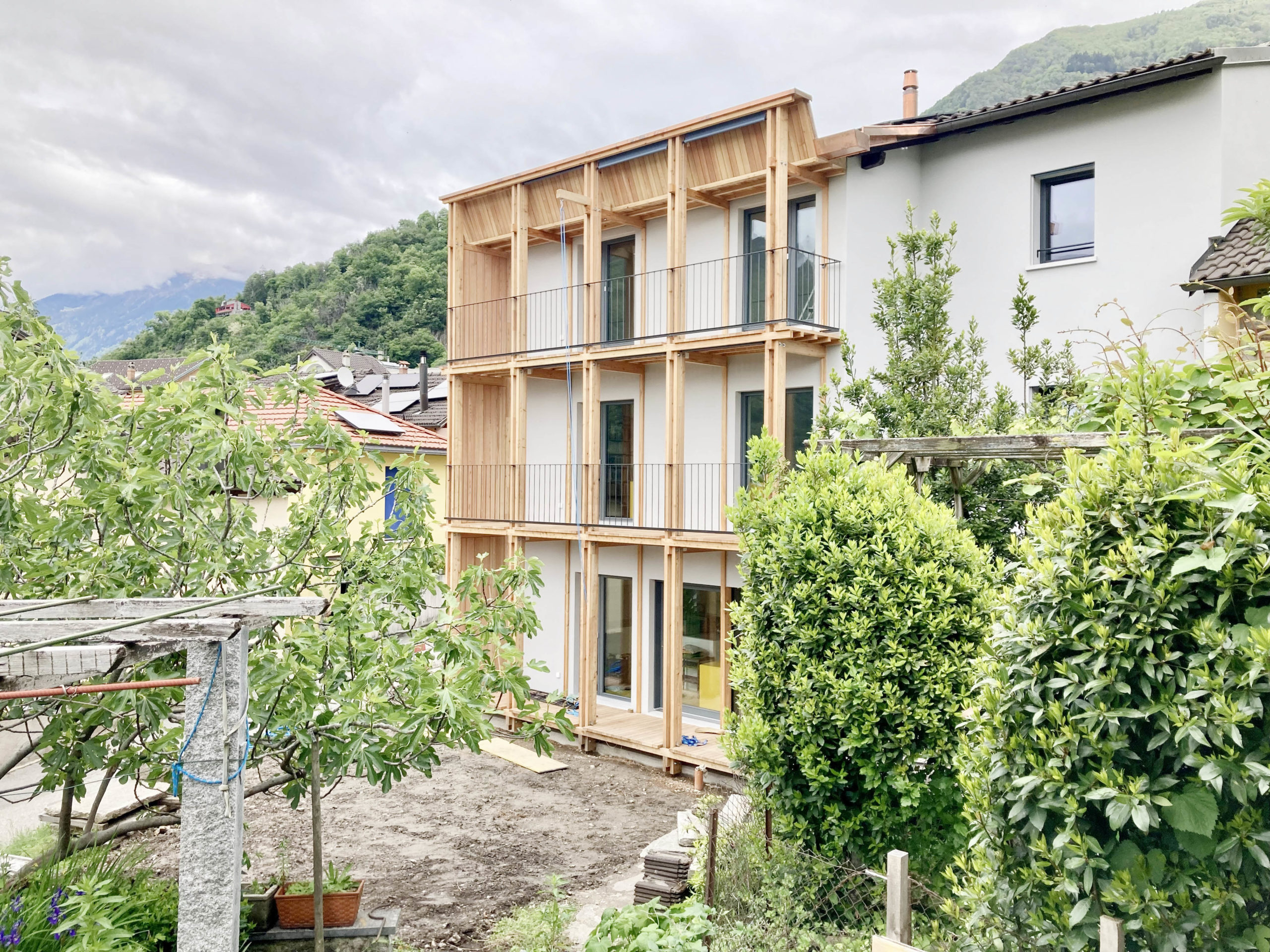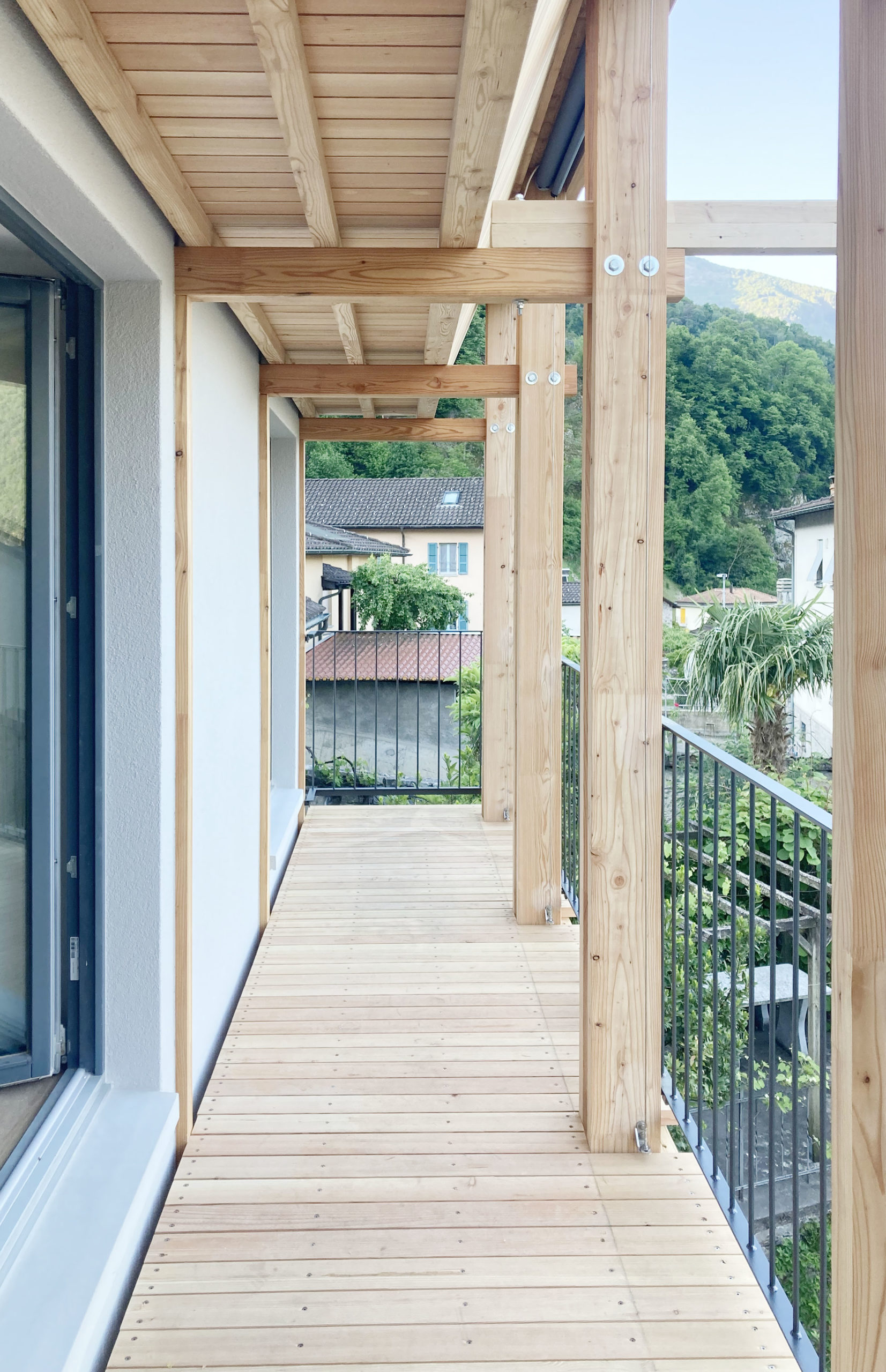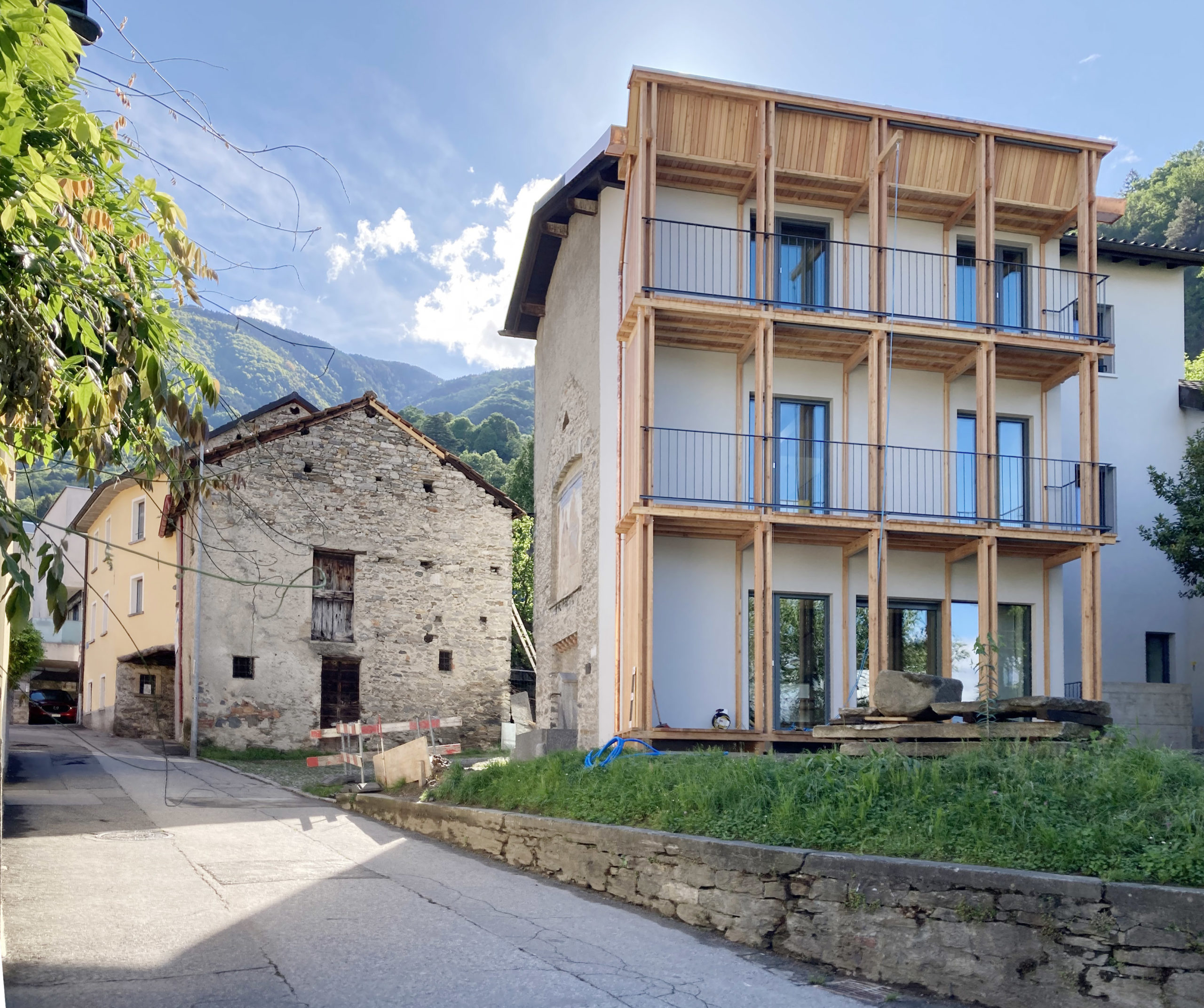 La ristrutturazione dell’abitazione di antiche origini posta all’entrata Ovest del nucleo di paese di Ravecchia deve confrontarsi con le sue successive trasformazioni, le quali ne hanno compromesso la tipologia e le proporzioni originali. Il progetto si propone di ridisegnare e riqualificare il prospetto principale e permettere quindi all’edificio di relazionarsi adeguatamente al contesto mediante la messa in opera di una nuova struttura di terrazze-ballatoio in legno, estesa all’insieme della superficie della facciata principale, ridisegnandone zoccolo, corpo principale e coronamento mediante il rilavoro dell’elemento di gronda.